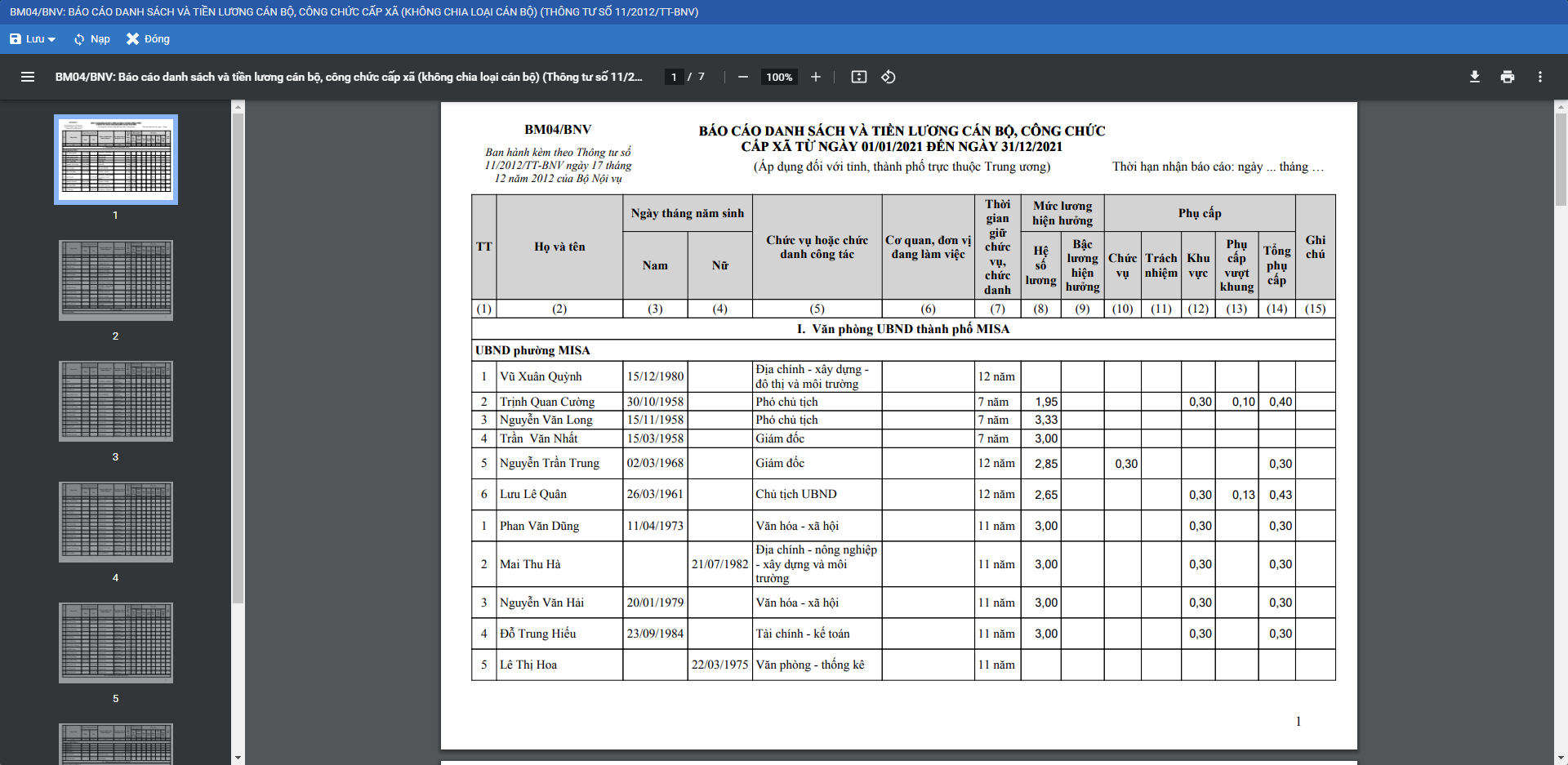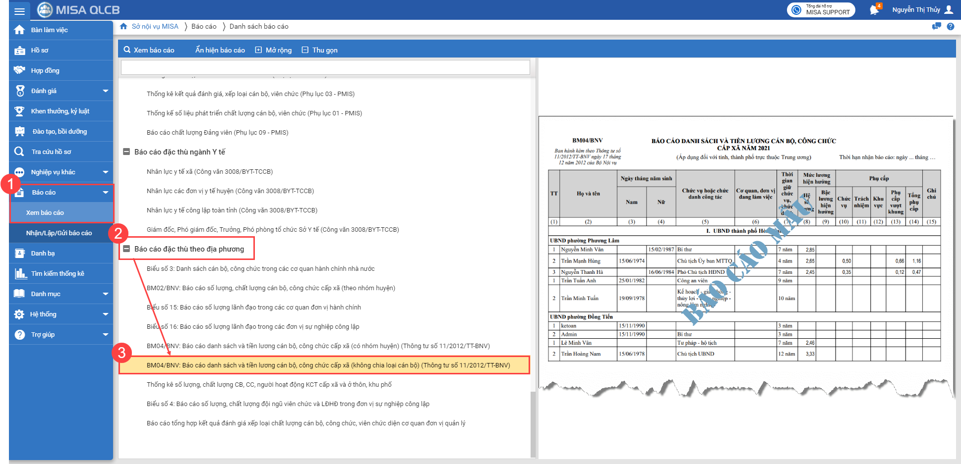 1. Tại menu Báo cáo\Xem báo cáo\Báo cáo theo đặc thù địa phương, phần mềm đã bổ sung báo cáo BM04/BNV: Báo cáo danh sách và tiền lương cán bộ, công chức cấp xã (không chia loại cán bộ) (Thông tư số 11/2012/TT-BNV).