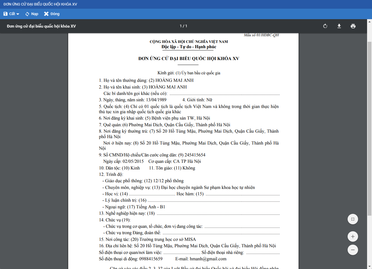 Đơn ứng cử đại biểu quốc hội khóa XV