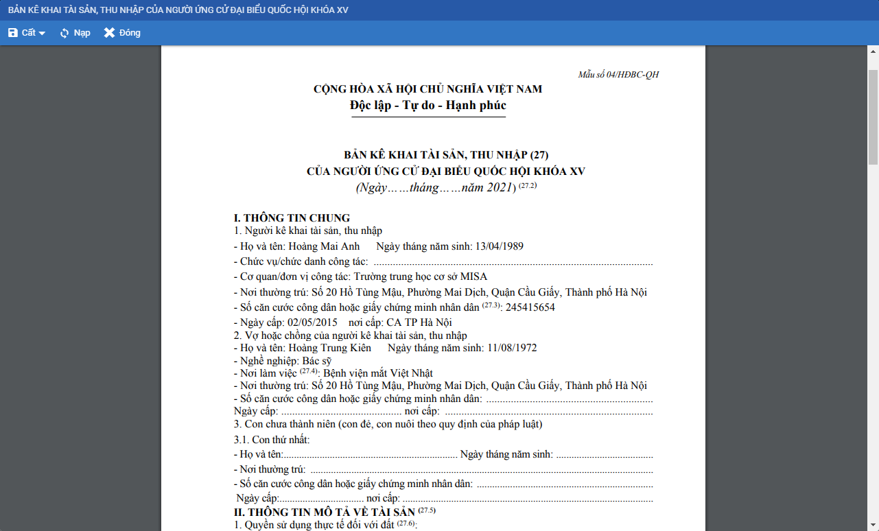 Bản kê khai tài sản, thu nhập của người ứng cử đại biểu quốc hội khóa XV