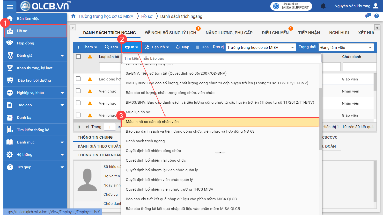 2. Ngoài ra có thể in mẫu báo cáo này tại menu Hồ sơ\tab Danh sách trích ngang.