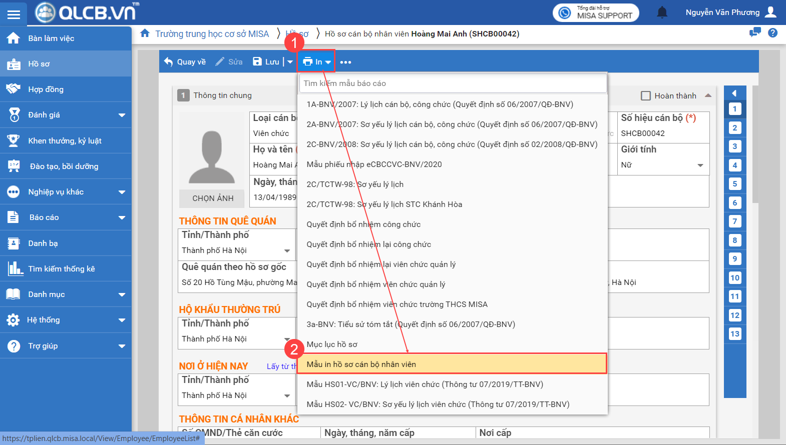 1. Khi CBTC khai báo hộ hoặc khai báo bổ sung các thông tin còn thiếu trong hồ sơ của CBNV, CBTC có thể nhấn In. Tại đây phần mềm đã bổ sung Mẫu in hồ sơ cán bộ nhân viên để có căn cứ xác nhận là đúng từ phía CBNV cũng như CBTC để có căn cứ làm các nghiệp vụ liên quan.