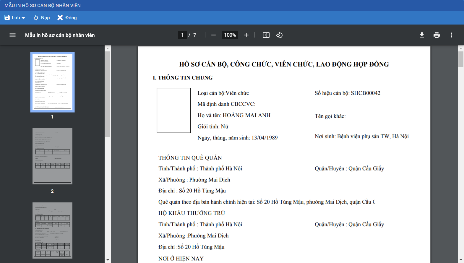 3. Chương trình in mẫu như sau: mẫu báo cáo sẽ in ra toàn bộ các thông tin tại giao diện hồ sơ CBNV (bao gồm cả phần CBTC đã cập nhật/bổ sung)
