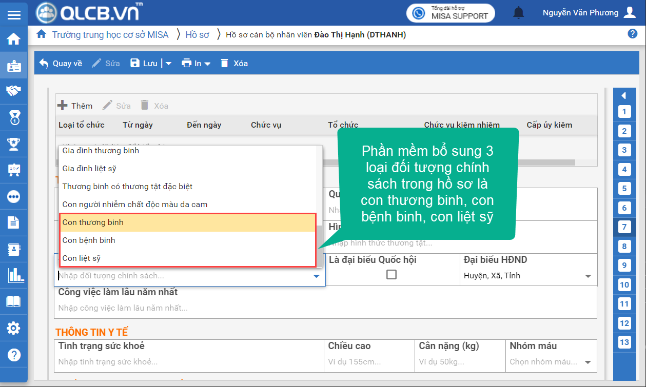 – Trước phiên bản R49, CBTC chưa thể chọn các đối tượng con thương binh, con bệnh binh, con liệt sỹ để khai báo cập nhật đúng lý lịch hồ sơ theo đúng đối tượng chính sách của CBNV.