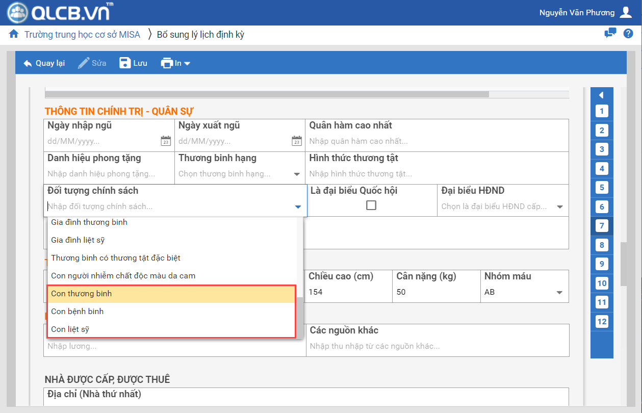 2. Tương tự, tại giao diện CBNV bổ sung lý lịch định kỳ, phần mềm cũng đã bổ sung 3 loại đối tượng chính sách trong hồ sơ là ” con thương binh, con bệnh binh, con liệt sỹ”.