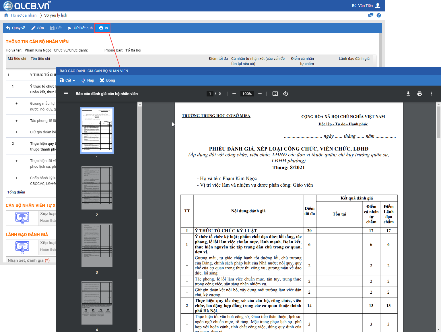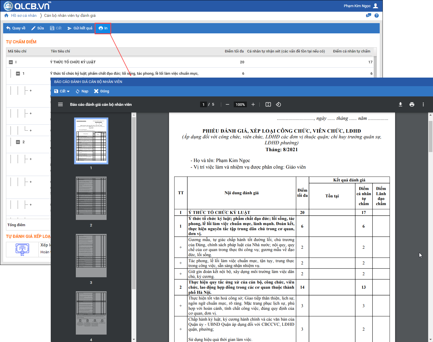 1. Tại phần CBNV tự đánh giá trực tuyến, sau khi tự đánh giá và nhấn Cất, phần mềm đã bổ sung tính năng In, cho phép anh/chị in được bảng đánh giá.