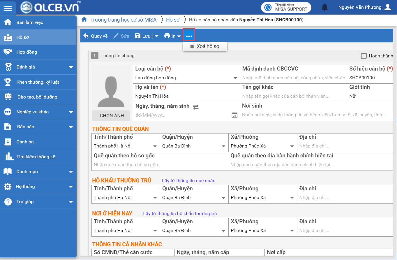 1. Tại menu Hồ sơ, trên thanh công cụ, khi cần xóa thông tin của CBNV, anh/chị cần nhấn vào biểu tượng dấu ba chấm, và nhấn Xóa hồ sơ.