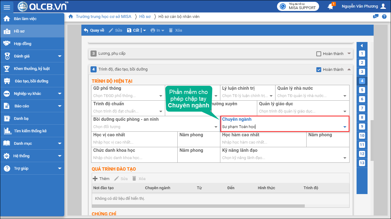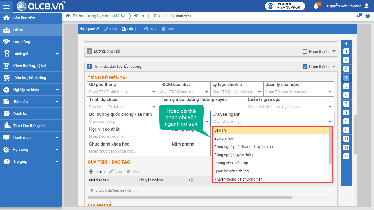 – Kể từ phiên bản R47, khi khai báo chuyên ngành trên phần trình độ hiện tại hoặc quá trình đào tạo của CBNV, phần mềm cho phép chọn hoặc nhập chuyên ngành.