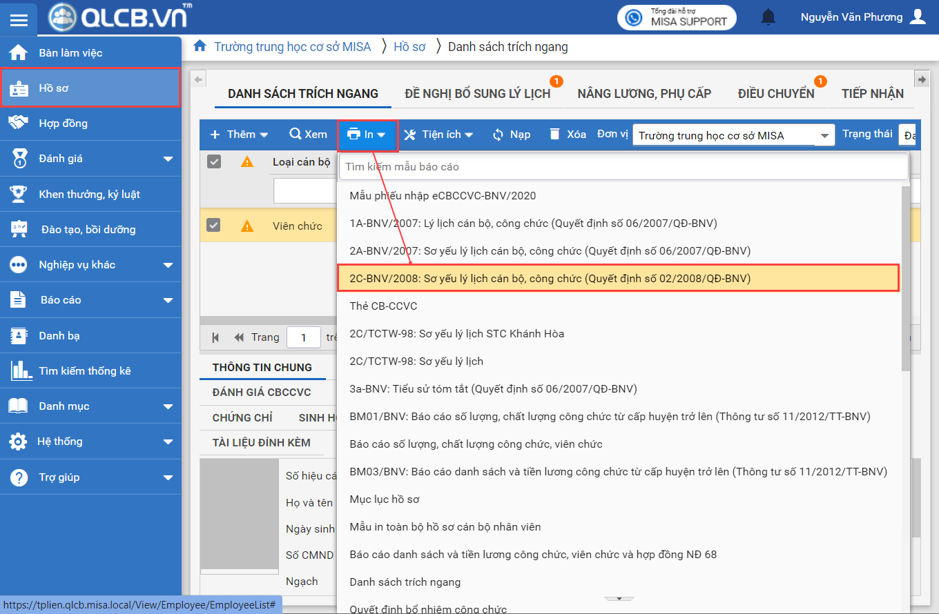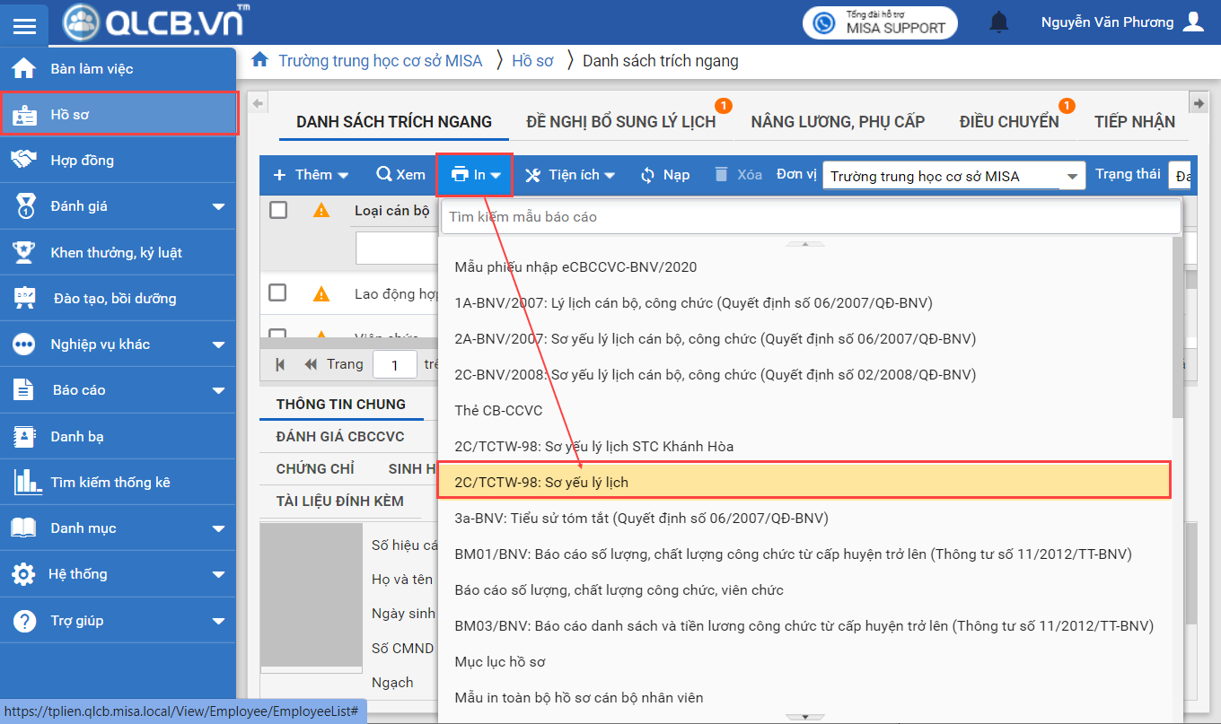1. In mẫu 2C/TCTW-98: Sơ yếu lý lịch tại màn hình Danh sách trích ngang, Hồ sơ chi tiết hoặc tại menu Báo cáo\Xem báo cáo.