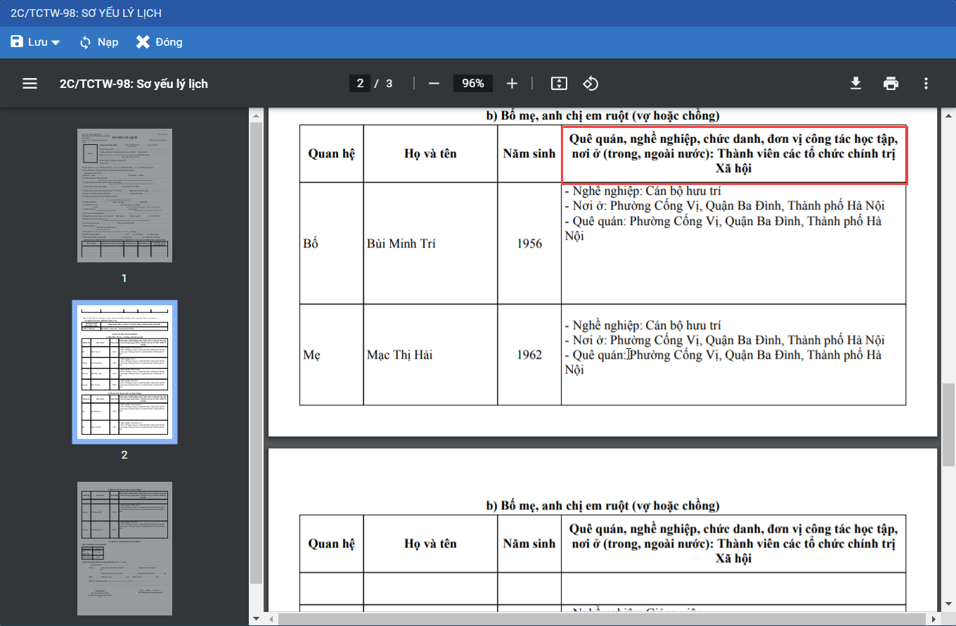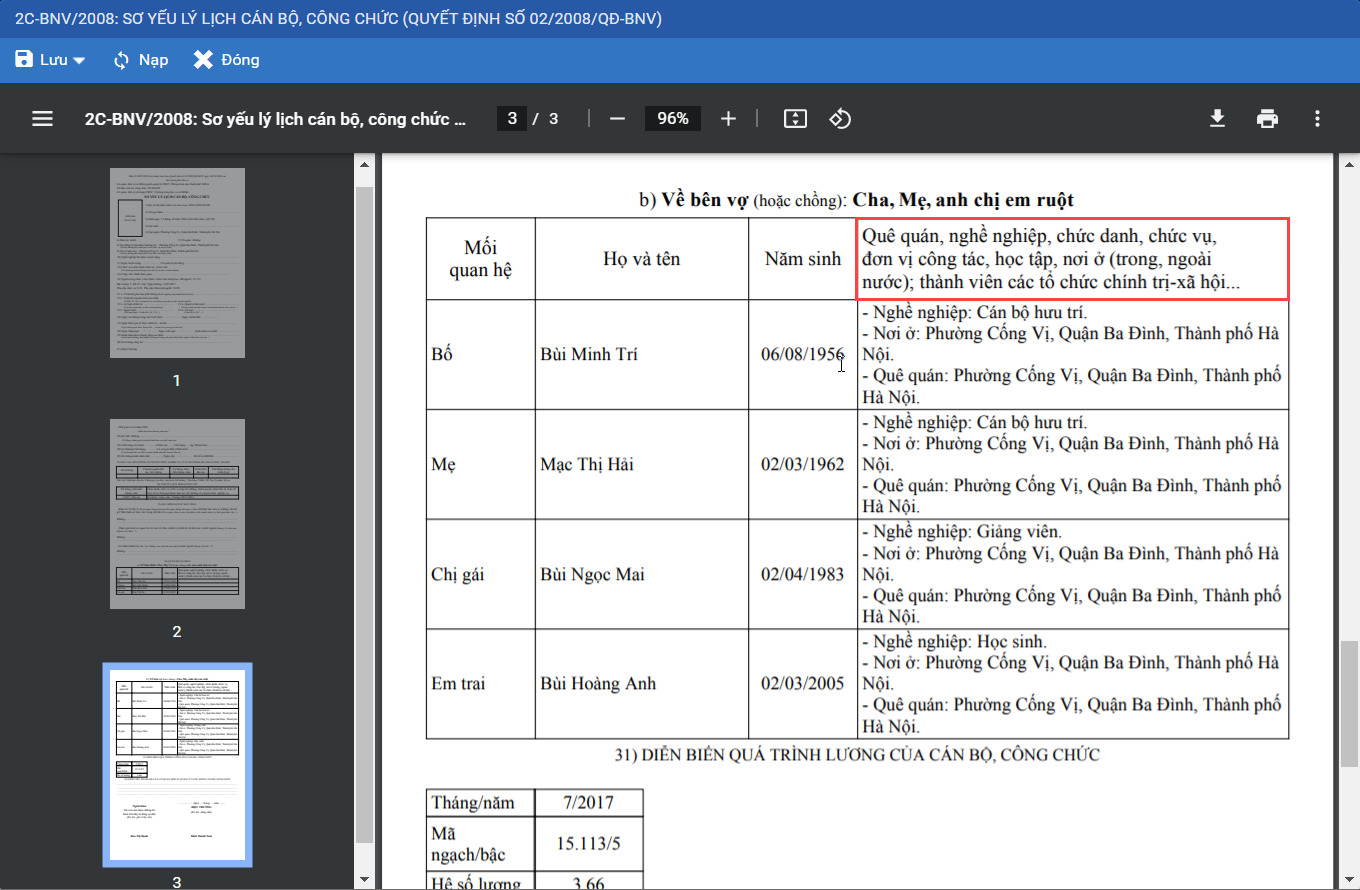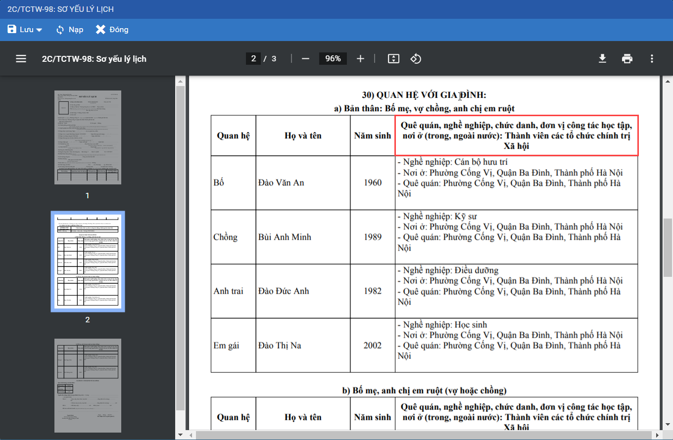 Giúp CBTC sắp xếp hiển thị phần Quan hệ gia đình chỉ tiêu 30 trên mẫu sơ yếu lý lịch 2C-BNV/2008 và 2C/98.