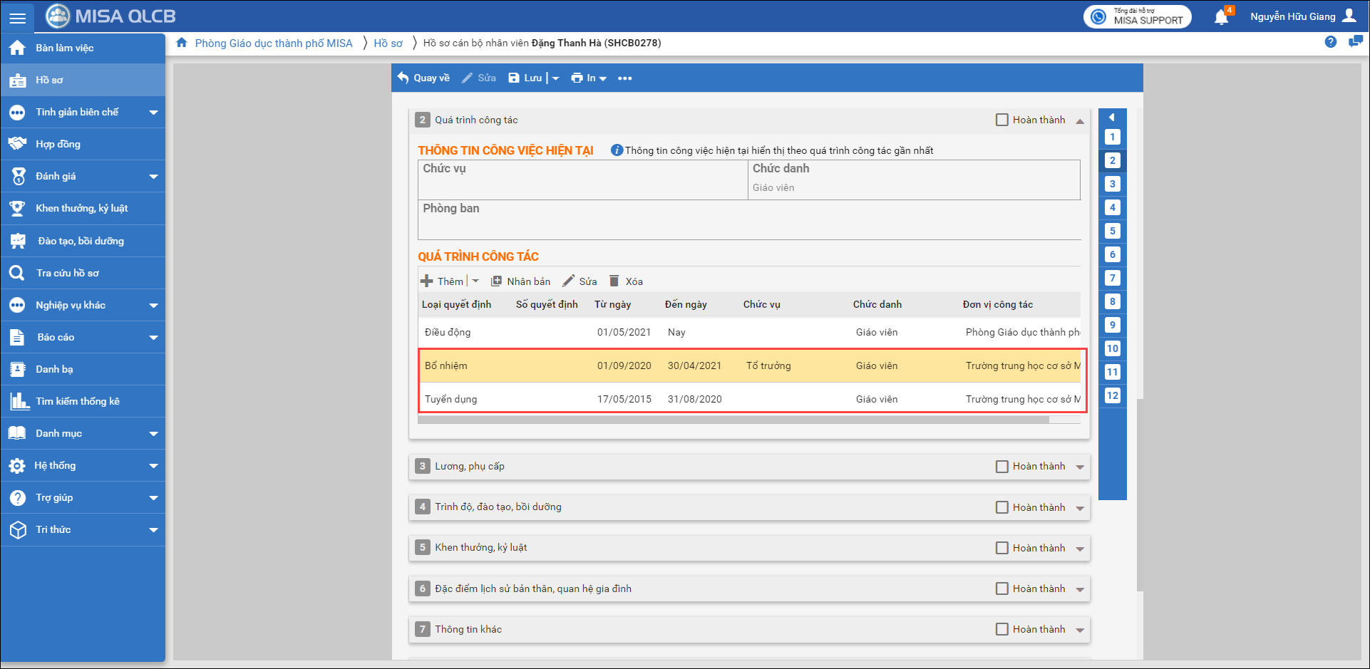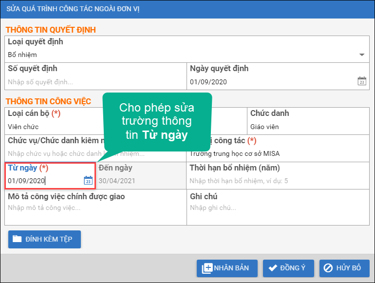 2. Đồng thời phần mềm cũng cho phép sửa các trường thông tin tại quá trình công tác ở đơn vị cũ.