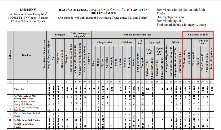 - Tuổi của CBNV được xác định bằng cách lấy Tháng/Năm thực hiện in báo cáo trừ (-) Tháng/Năm sinh.