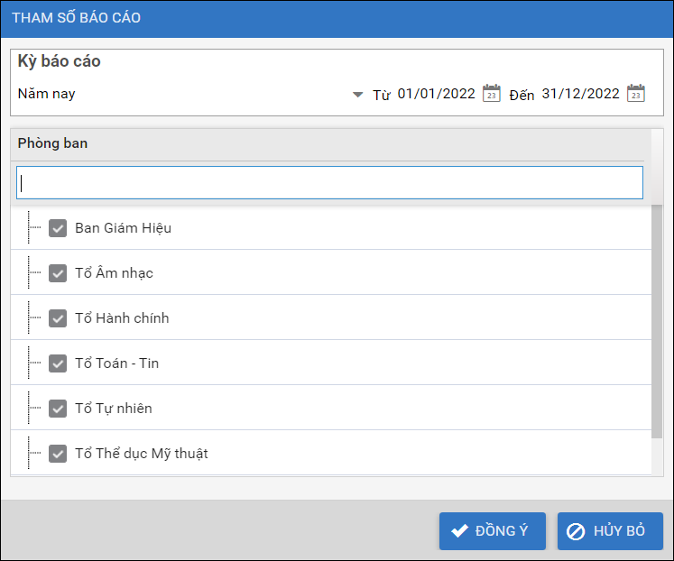 1. Tại menu Báo cáo\Xem báo cáo, phần mềm đã bổ sung tham số phòng ban khi in một số báo cáo sau: