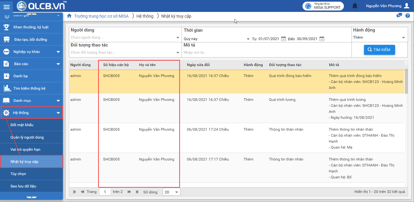 1. Tại menu Hệ thống\Nhật ký truy cập, phần mềm đã bổ sung cột Số hiệu cán bộ và cột Họ và tên, giúp CBTC dễ dàng xem được tên người truy cập.