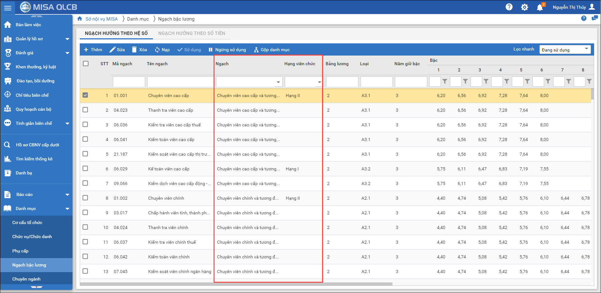 Tại menu Danh mục\Ngạch bậc lương, phần mềm đã bổ sung cột Ngạch và Hạng viên chức, đơn vị có thể dễ dàng đối chiếu các báo cáo thống kê có thống kê theo ngạch/hạng viên chức.