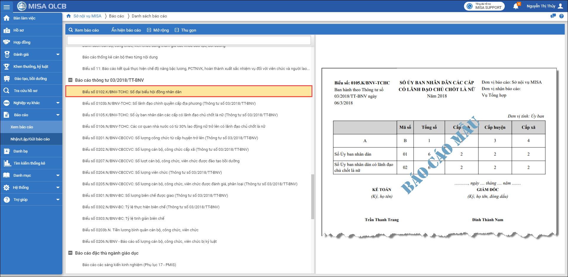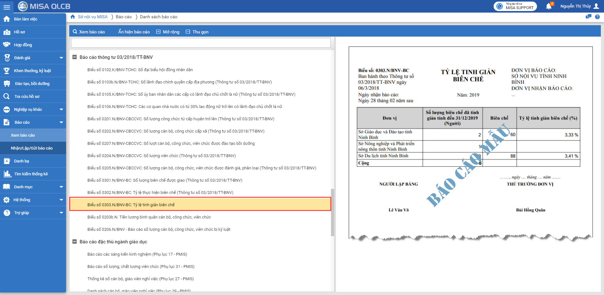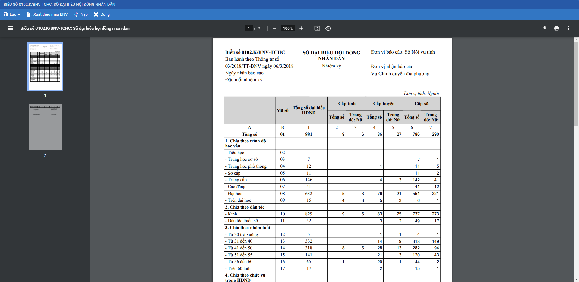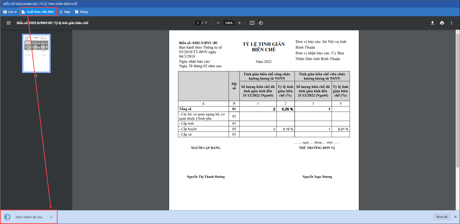 - Hàng năm SNV cần phải báo cáo số liệu về các báo cáo thuộc bộ TT03/2018 trên hệ thống nộp báo cáo của Bộ nội vụ, trên hệ thống này có thể nhập tay, nhập qua file excel, file mẫu nhập khẩu tương tự như mẫu báo cáo tuy nhiên sẽ bỏ bớt các dòng trên báo cáo. Hiện tại trên PM khi xuất khẩu, PM xuất ra cả tên báo cáo, đơn vị phải chỉnh sửa lại hay copy số liệu sang file chuẩn của phần mềm BNV => mất nhiều thời gian và công sức.