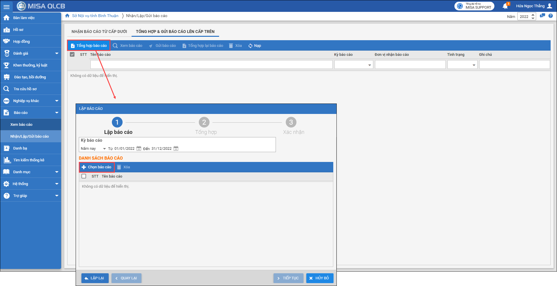 4. Khi nhấn Nhận/Lập/Gửi báo cáo, tại tab Tổng hợp và gửi báo cáo lên cấp trên, nhấn Tổng hợp báo cáo: