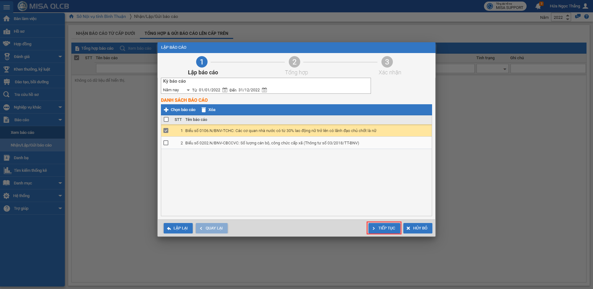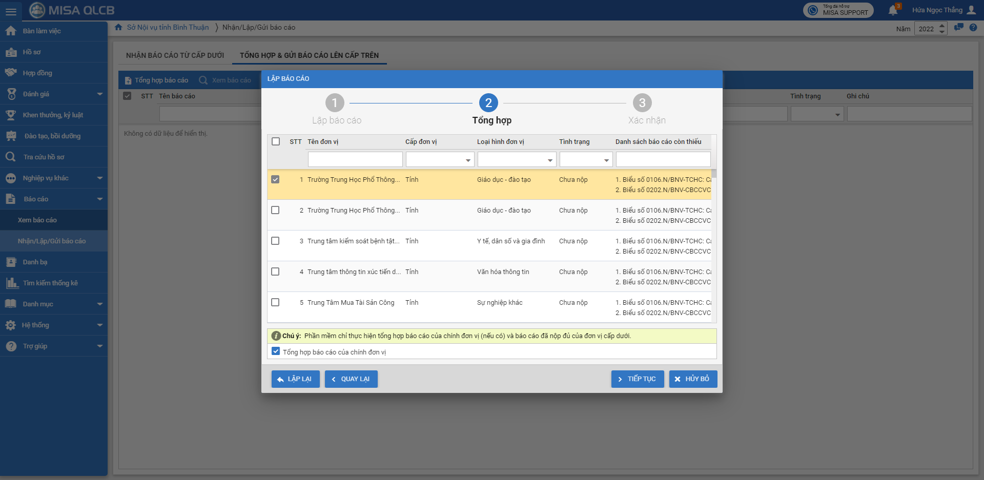 - Tổng hợp: Tại bước này, anh/chị tích chọn những đơn vị cần tổng hợp, đồng thời tích chọn Tổng hợp báo cáo của chính đơn vị nếu cần tổng hợp cả báo cáo của đơn vị. Nhấn Tiếp tục.
