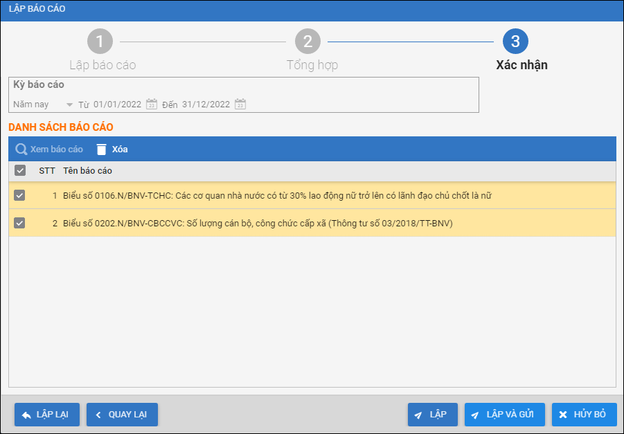 - Xác nhận: Tại bước Xác nhận, tích chọn danh sách báo cáo, nhấn Lập và gửi.