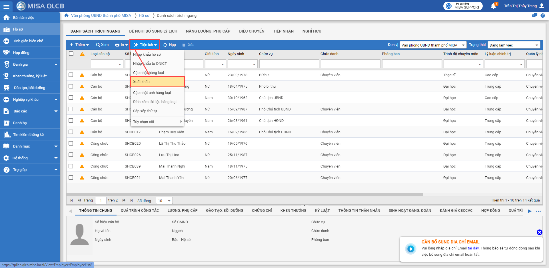 1. Tại Văn phòng UBND TP MISA, thực hiện xuất khẩu file danh sách CBNV.