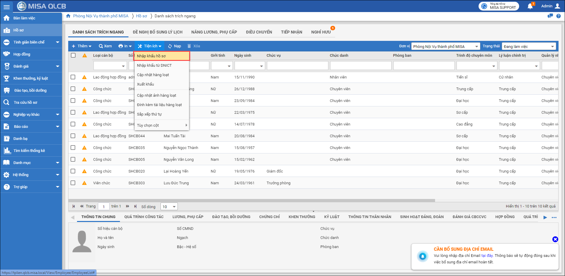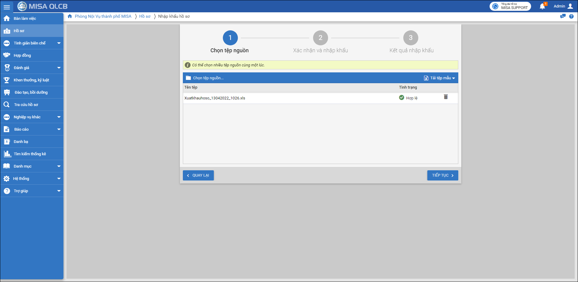 2. Tại đơn vị Phòng nội vụ TP MISA, thực hiện nhập khẩu file vừa xuất khẩu vào phần mềm.