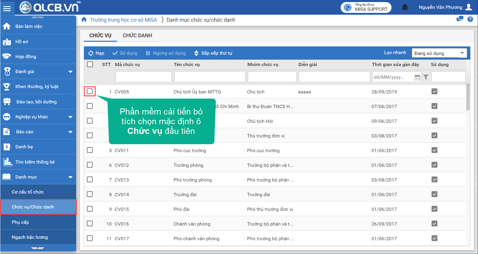 2. Ví dụ: Tại danh mục Chức vụ, phần mềm đã cải tiến bỏ tích chọn mặc định ở ô Chức vụ đầu tiên.