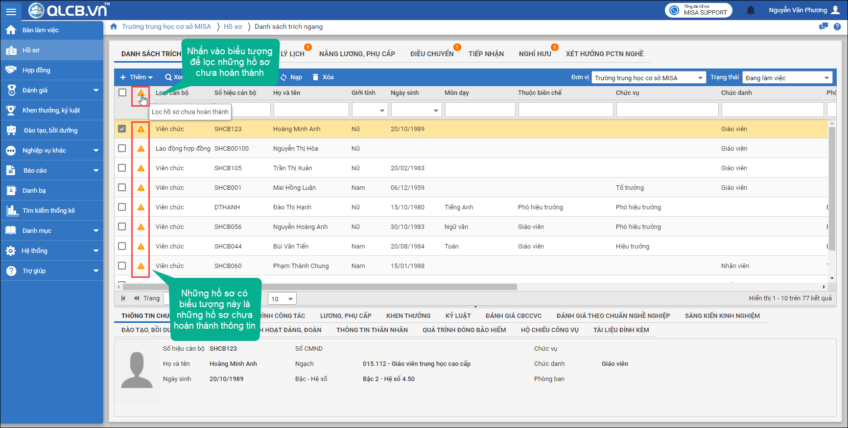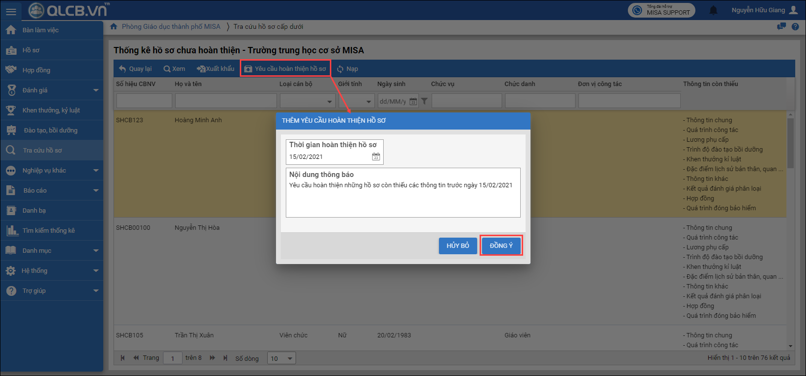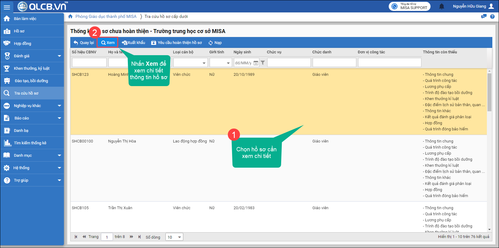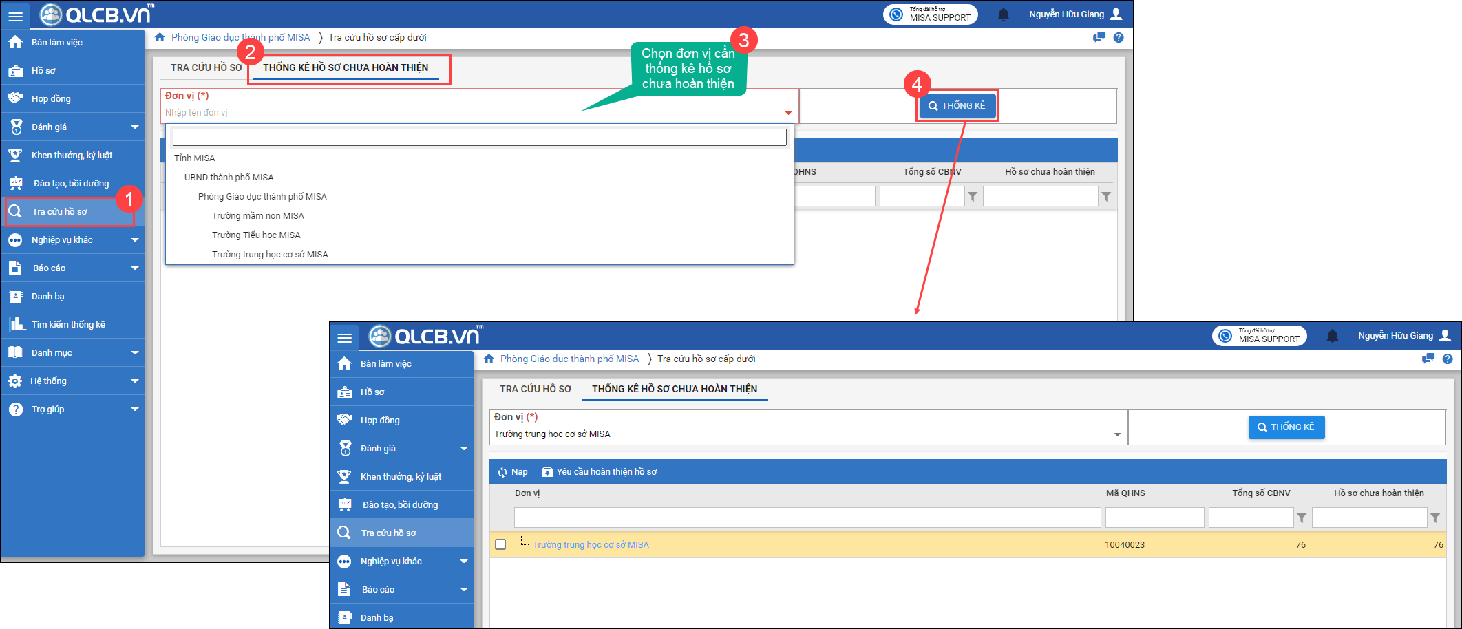 - Ví dụ: Thống kê hồ sơ chưa hoàn thiện của Trường THCS MISA.