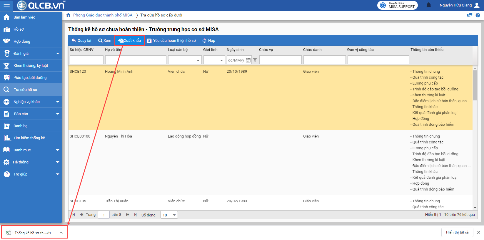 5. Có thể xuất khẩu danh sách hồ sơ chưa hoàn thiện bằng cách nhấn Xuất khẩu, chương trình sẽ tải file hồ sơ chưa hoàn thiện. Anh/chị nhấn vào file vừa tải về để xem.