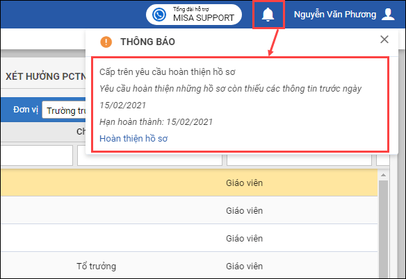7. Sau khi đơn vị chủ quản gửi thông báo yêu cầu hoàn thiện hồ sơ, đơn vị cấp dưới sẽ nhận được thông báo và vào menu Hồ sơ để hoàn thiện những hồ sơ còn thiếu thông tin ( hoặc nhấn vào Hoàn thiện hồ sơ trên thông báo)