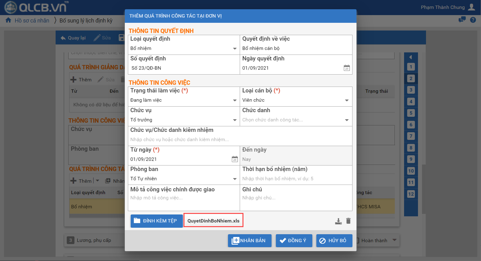 – Kể từ phiên bản R50, khi CBNV vào bổ sung lý lịch định kỳ: phần mềm cho phép có thể đính kèm tài liệu vào từng form khai báo thông tin như đối với màn hình CBTC.