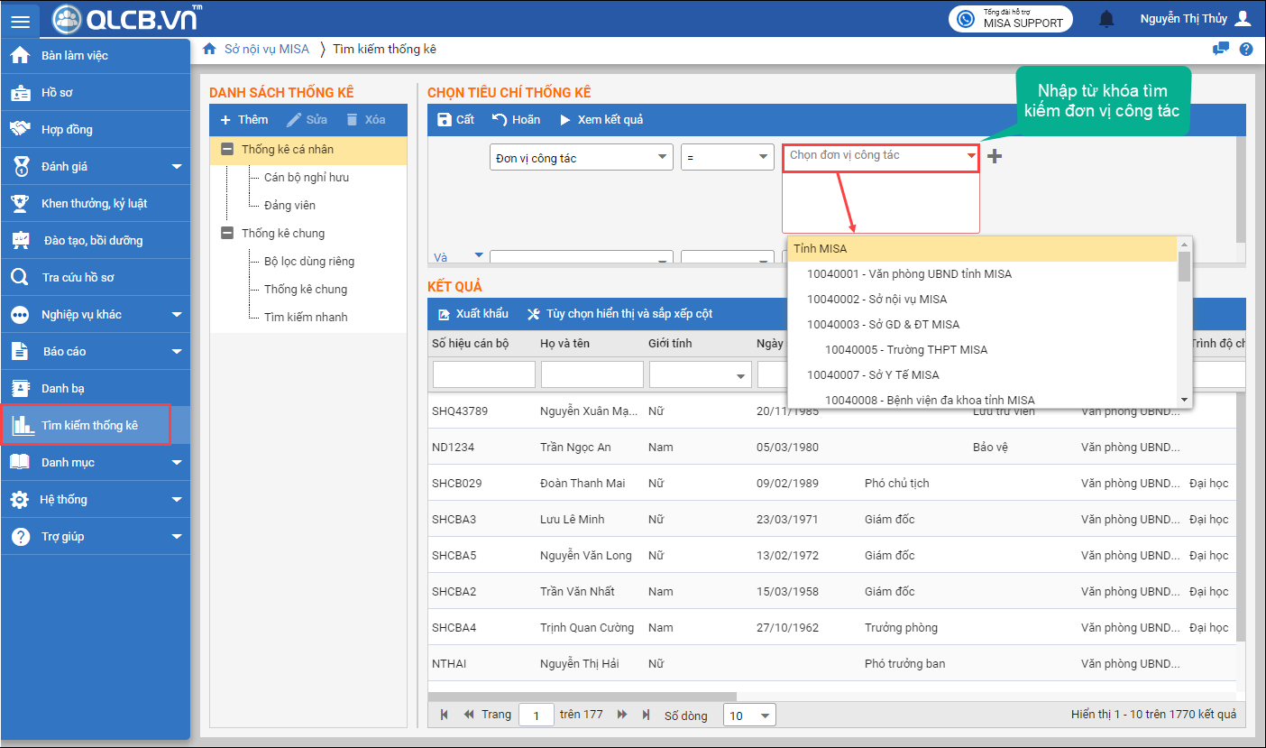 Giúp CBTC chọn nhanh “đơn vị công tác” ở chức năng tìm kiếm thống kê.