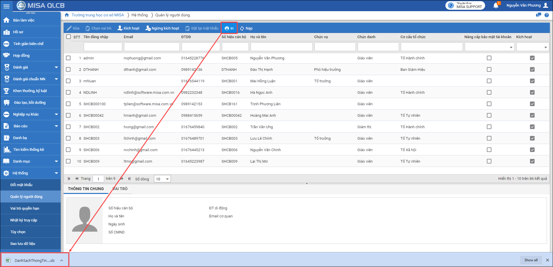 1. Tại menu Quản lý người dùng, phần mềm đã bổ sung chức năng In.