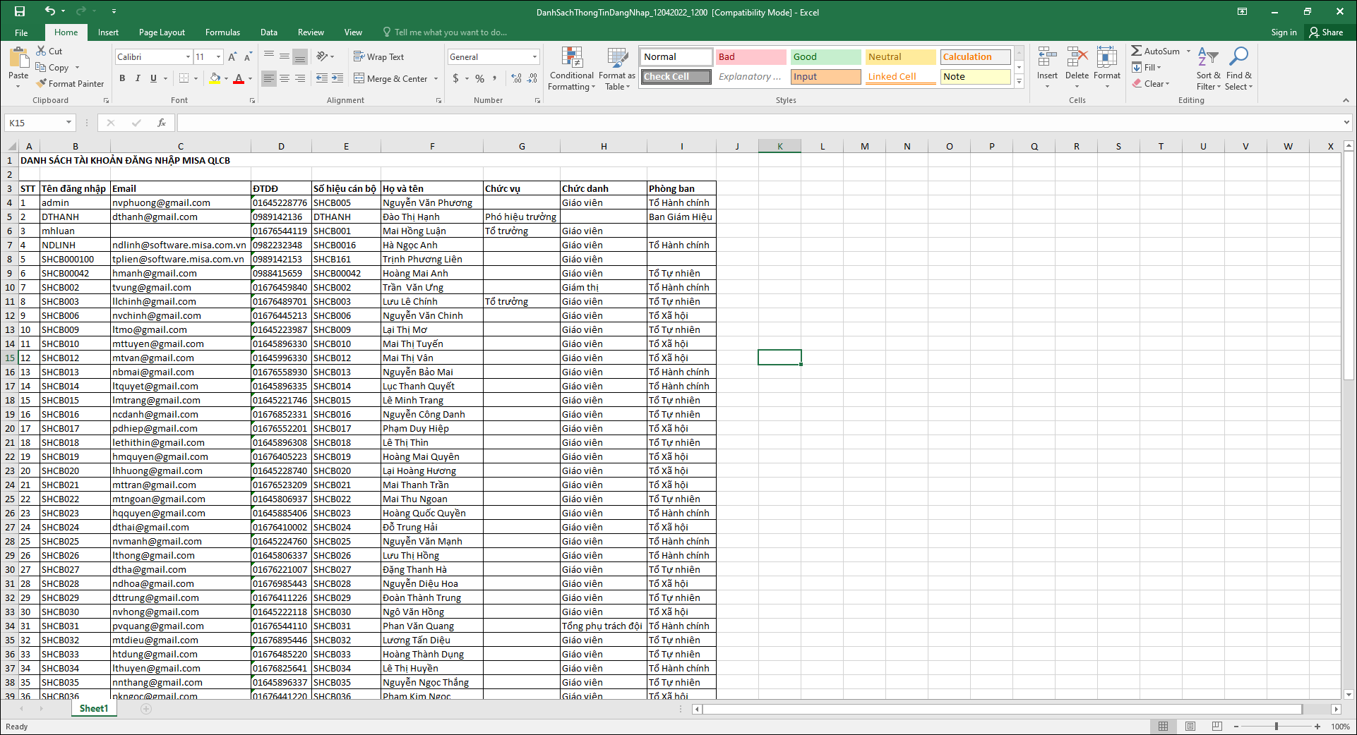 2. Khi đó phần mềm sẽ xuất khẩu ra danh sách CBNV có thông tin Tên đăng nhập, Số hiệu cán bộ, Họ và tên, Chức vụ, Chức danh, Phòng ban dưới dạng excel.