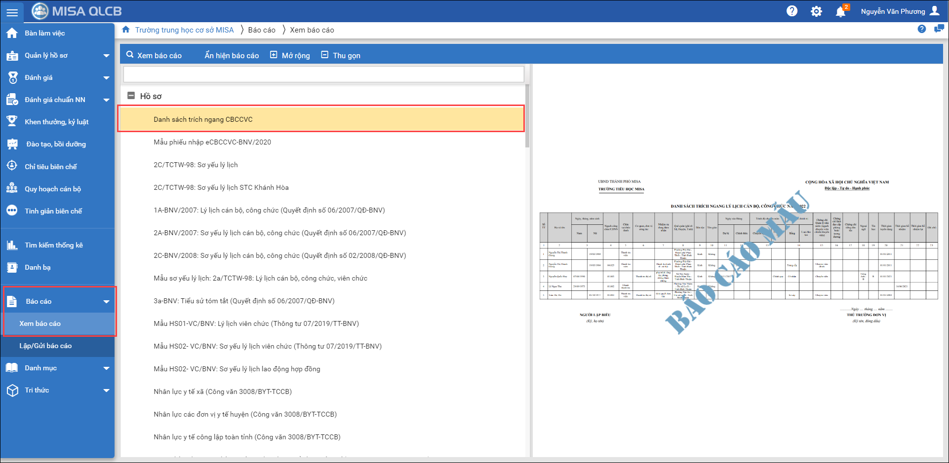 1. Tại menu Báo cáo\Xem báo cáo, tại đây phần mềm đã bổ sung báo cáo Danh sách trích ngang CBCCVC.