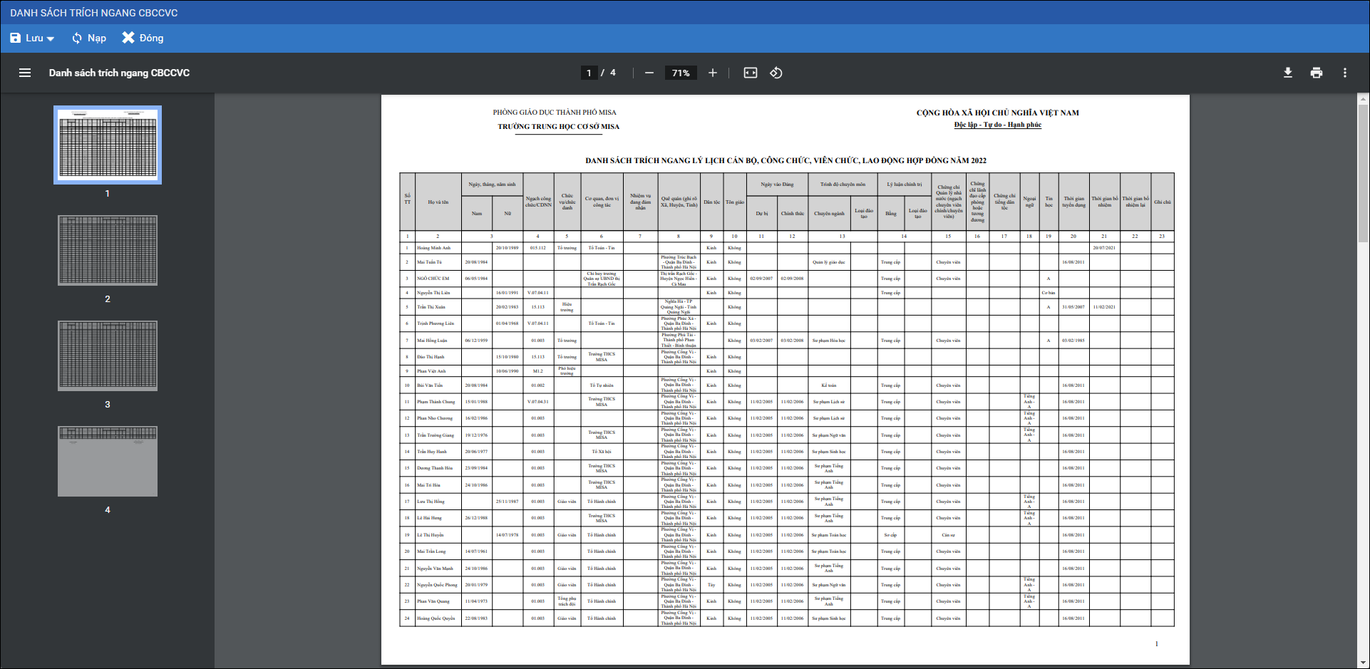 Hiện tại phần mềm đã có mẫu Danh sách trích ngang tuy nhiên cách thể hiện nội dung trình độ chuyên môn, lý luận chính trị, chứng chỉ quản lý nhà nước, chưa đáp ứng cách thể hiện giống đơn vị mong muốn và chưa có thông tin chứng chỉ lãnh đạo quản lý, thời gian bổ nhiệm, bổ nhiệm lại.