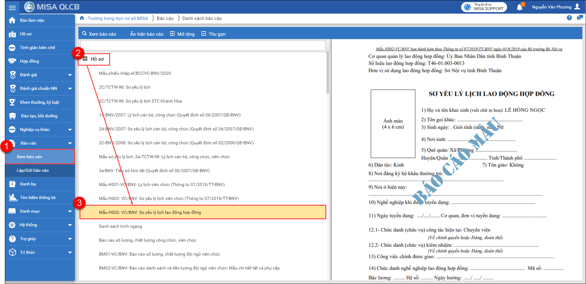1. Tại menu Báo cáo\Xem báo cáo\Hồ sơ, phần mềm đã bổ sung mẫu Hs02- VC/BNV: Sơ yếu lý lịch lao động.