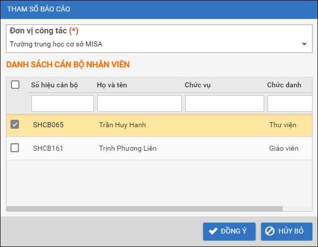 - Phần mềm tự động lấy lên những CBNV thuộc loại Lao động hợp đồng. Tích chọn CBNV cần in báo cáo và nhấn Đồng ý.