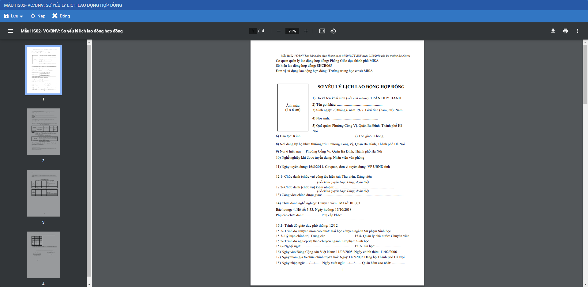 – Trước phiên bản R54, đơn vị có các đối tượng là Lao động hợp đồng, theo quy định chưa có mẫu sơ yếu lý lịch nào dành cho đối tượng này. Do đó SYT chỉ đạo có thể áp dụng mẫu HS02VC/BNV để dùng cho đối tượng này. tuy nhiên các phần tittle từ Viên chức cần đổi thành “Lao động hợp đồng” để phân biệt đối tượng.`