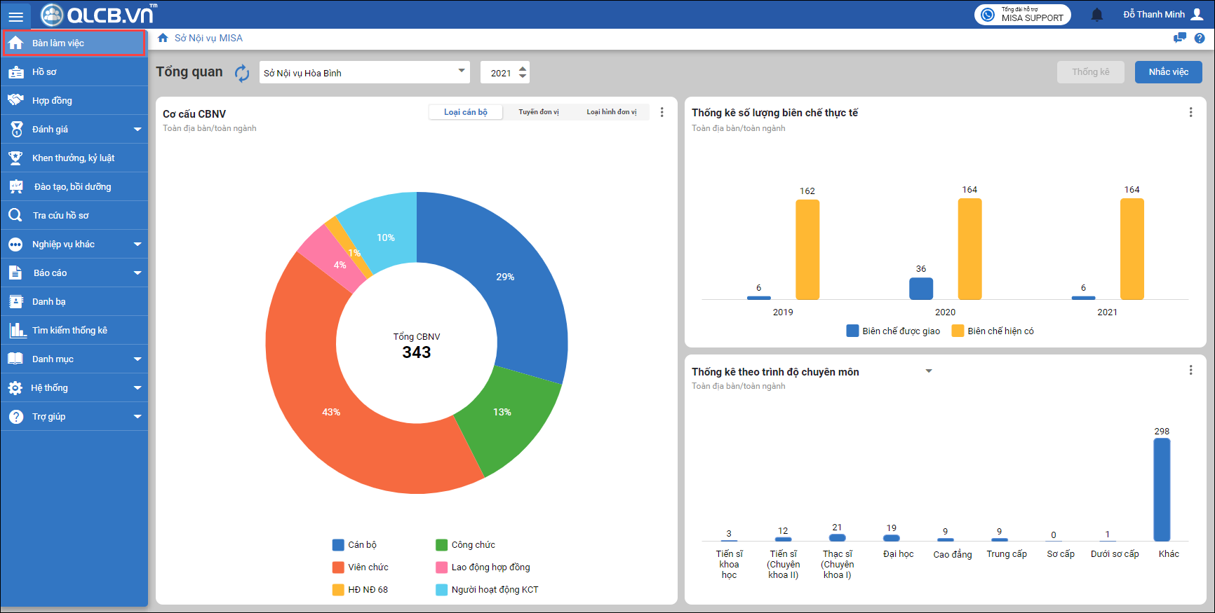 Giúp CBTC thống kê chi tiết biểu đồ để xem nhanh và thống kê xuất báo cáo các thông tin số lượng CBNV trong toàn tỉnh phân theo từng loại cán bộ.