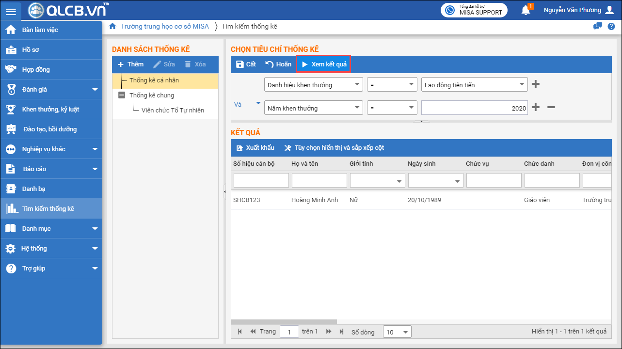 Ví dụ: Tìm kiếm CBNV được khen thưởng danh hiệu Lao động tiên tiến vào năm 2020: chọn các điều kiện tìm kiếm và nhấn Xem kết quả.
