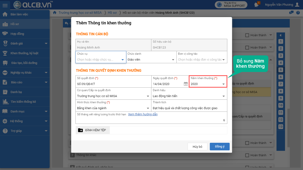 1. Tại menu Hồ sơ, phần 5. Khen thưởng, kỷ luật, khi thêm quyết định Khen thưởng hoặc Kỷ luật, phần mềm đã bổ sung thêm Năm khen thưởng để anh/chị có thể khai báo thêm năm khen thưởng.