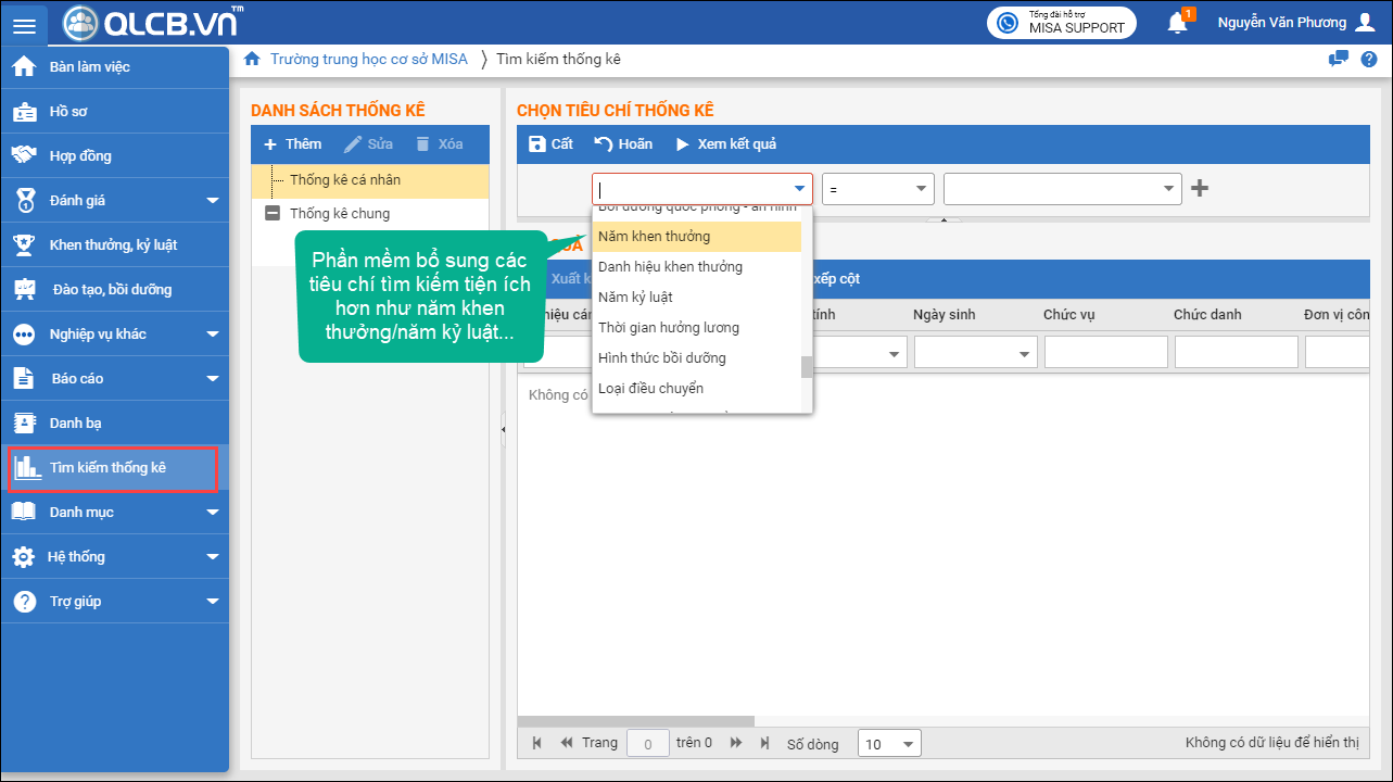 2. Vào menu Tìm kiếm thống kê, tại đây phần mềm đã cải tiến tính năng tìm kiếm thống kê để bổ sung thêm các tiêu chỉ tìm kiếm tiện ích hơn như năm khen thưởng/năm kỷ luật…