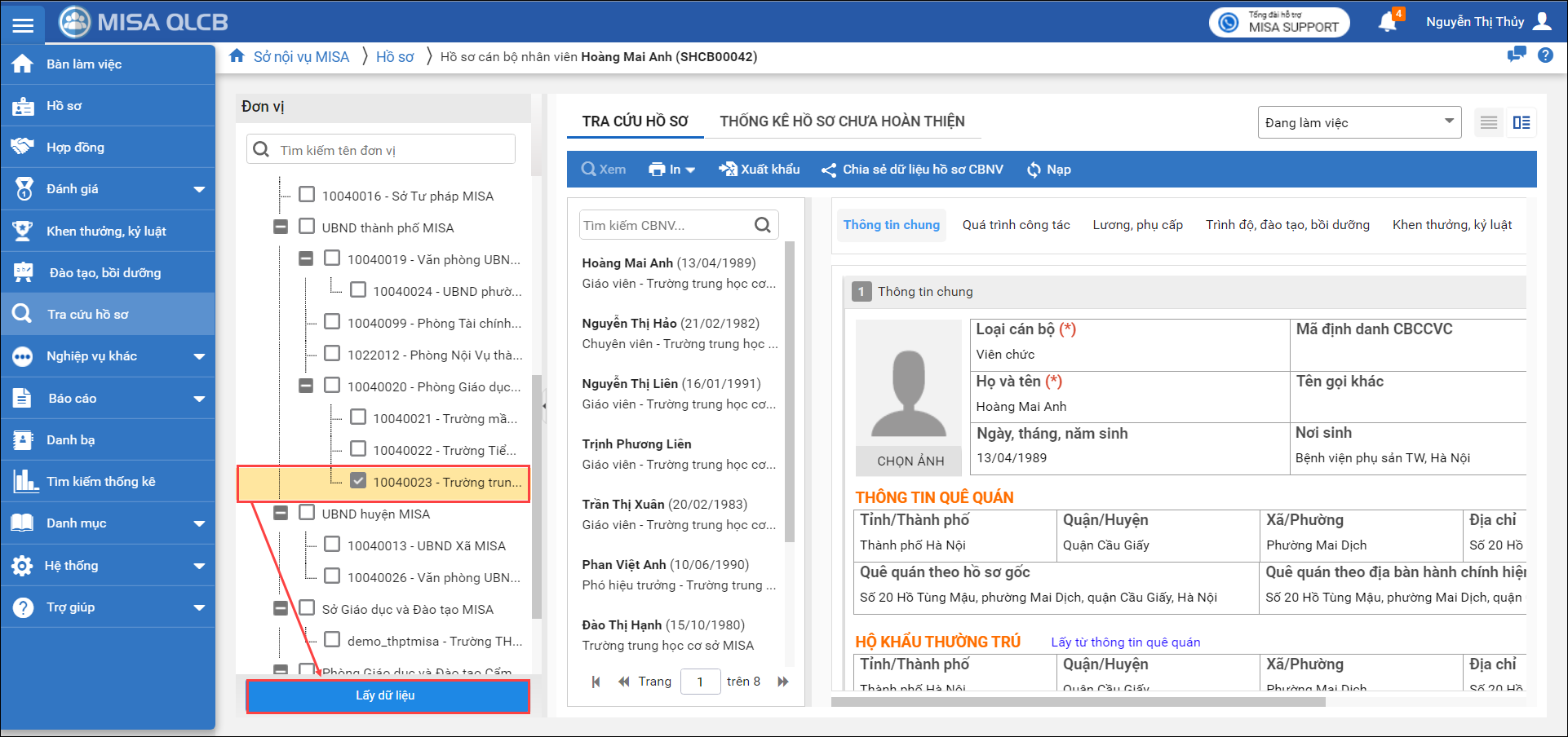 1. Tại menu Tra cứu hồ sơ, phần mềm hiển thị cây đơn vị để cấp trên có thể tích chọn xem một hoặc nhiều đơn vị, nhấn Lấy dữ liệu => Hệ thống sẽ tự động load lên danh sách CBNV của các đơn vị đã được tích chọn tương ứng.