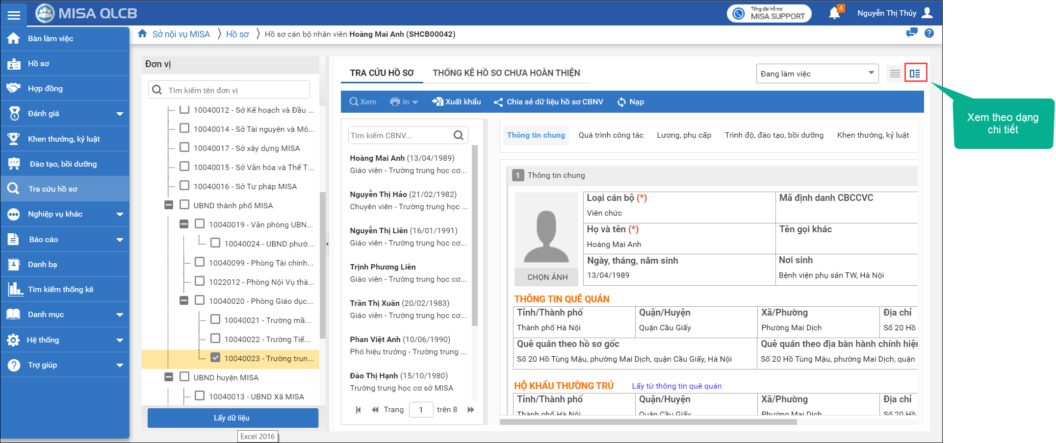 - Hiển thị theo dạng chi tiết: sau khi chọn CBNV của đơn vị đã được chọn, hệ thống sẽ hiển thị chi tiết thông tin cá nhân của CBNV đó.