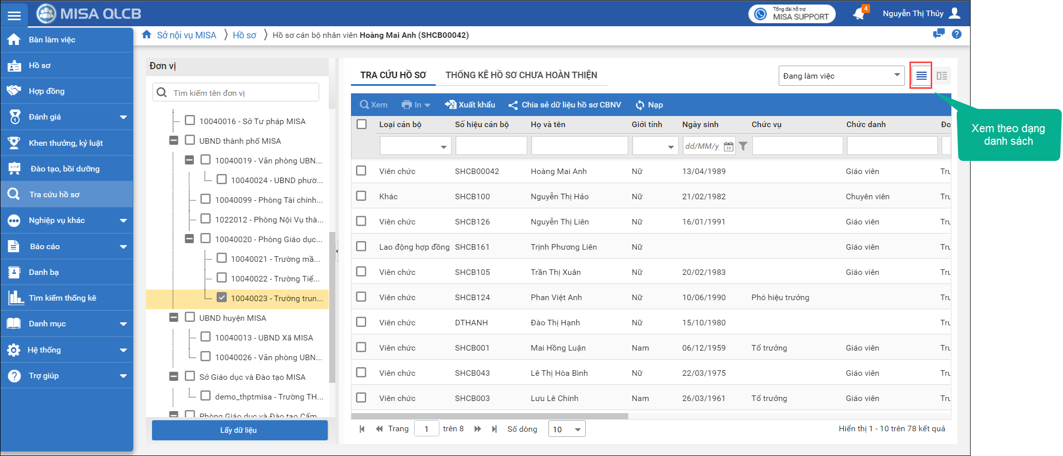 2. Tại phần danh sách CBNV, chương trình cho phép hiển thị theo dạng danh sách hoặc dạng chi tiết.