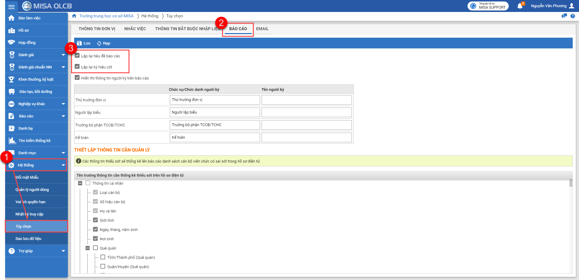1. Trên menu Hệ thống\Tùy chọn\Báo cáo, phần mềm đã bổ sung tùy chọn cho phép in báo cáo ra sẽ hiển thị tiêu đề cột và ký hiệu cột lặp lại ở trang sau để khi xuất khẩu báo cáo thì sẽ hiển thị/không hiển thị tương ứng theo tùy chọn.