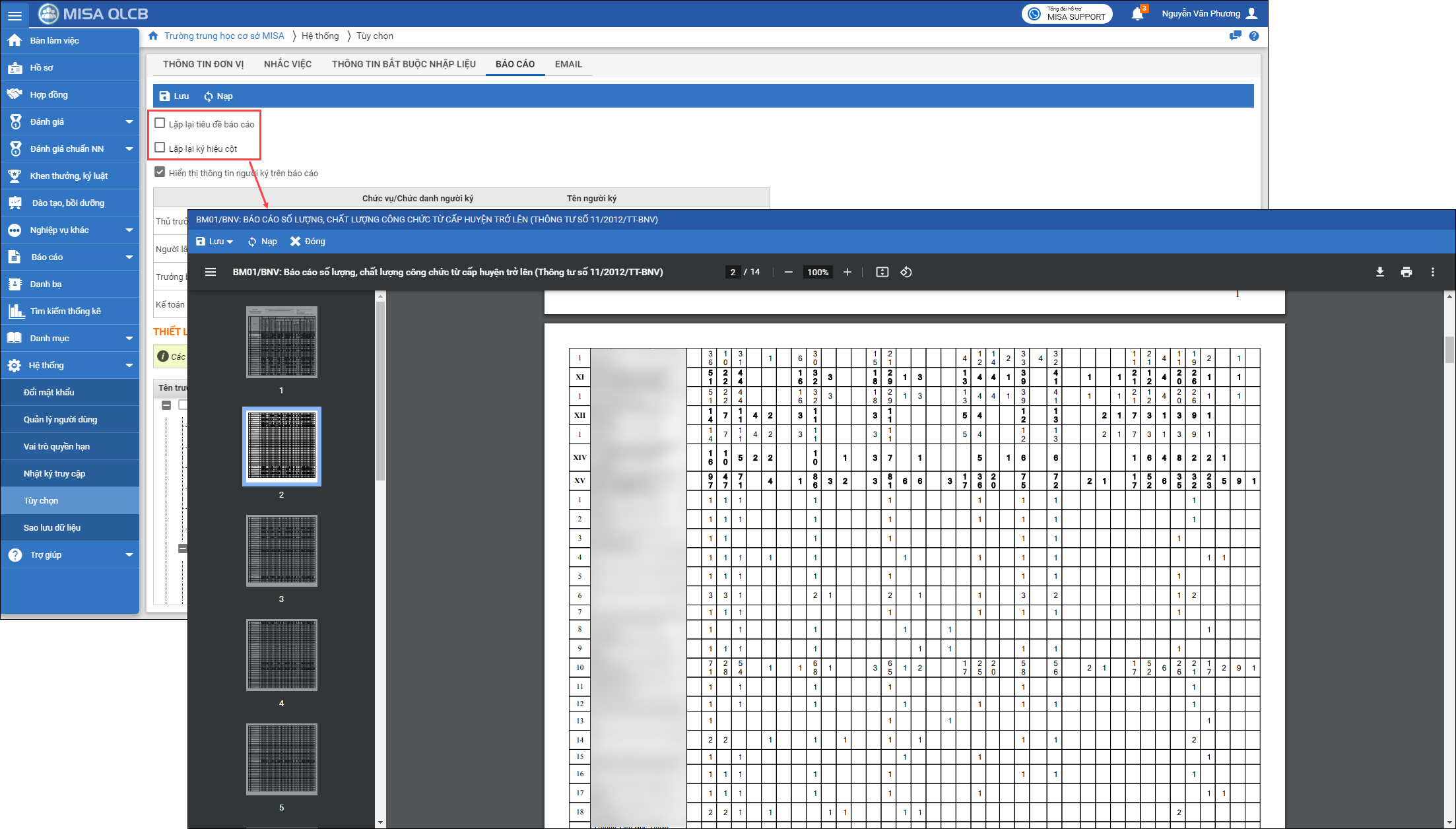 Khi xuất báo cáo ra excel sẽ không lặp lại tiêu đề cột từ trang thứ 2 đáp ứng yêu cầu của SNV Bình Thuận.