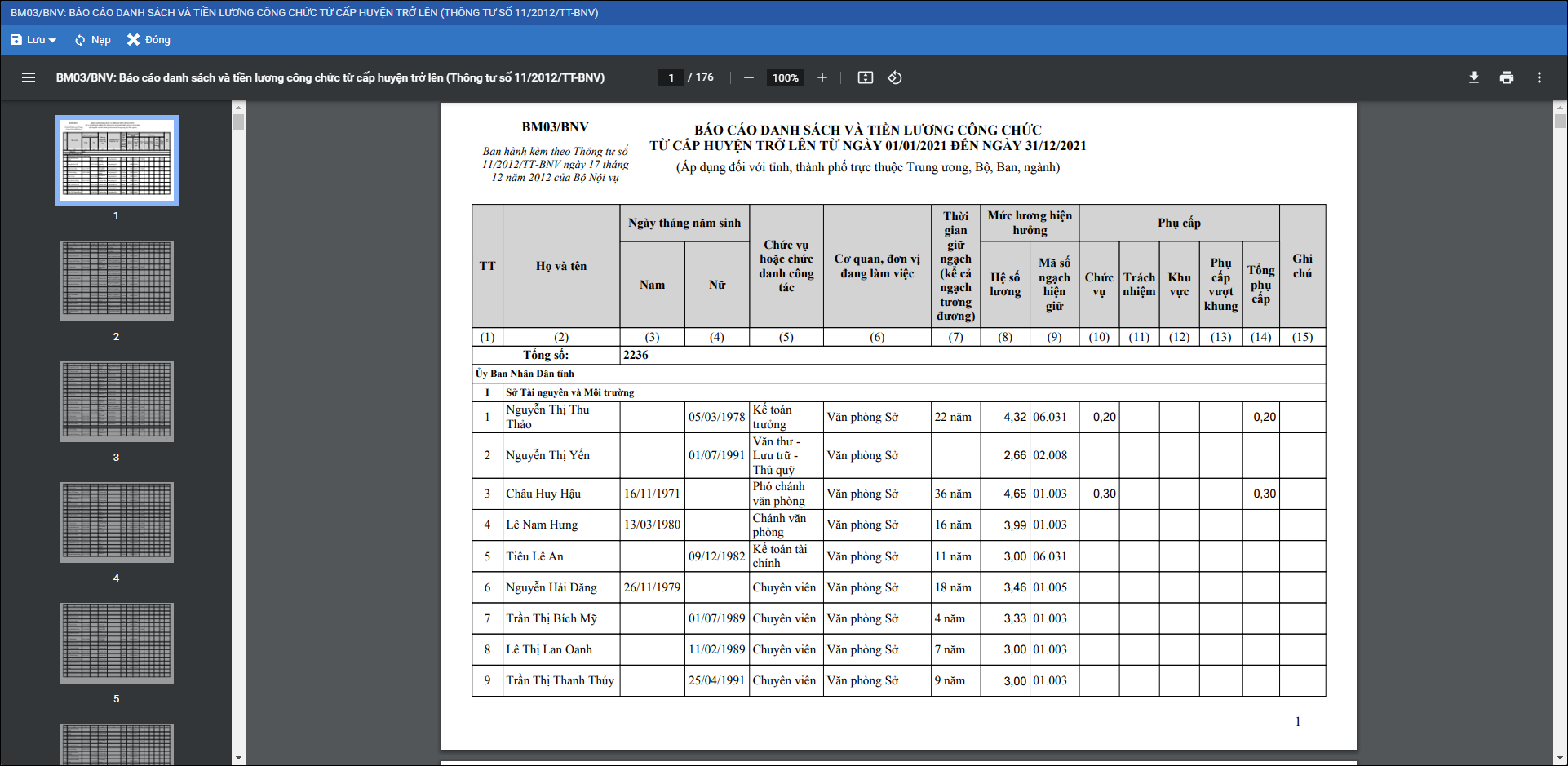 Ví dụ: Tại menu Báo cáo\Xem báo cáo\Báo cáo\Hồ sơ, chọn in báo cáo BM03/BNV: Báo cáo danh sách và tiền lương công chức từ cấp huyện trở lên (Thông tư số 11/2021/TT-BNV).