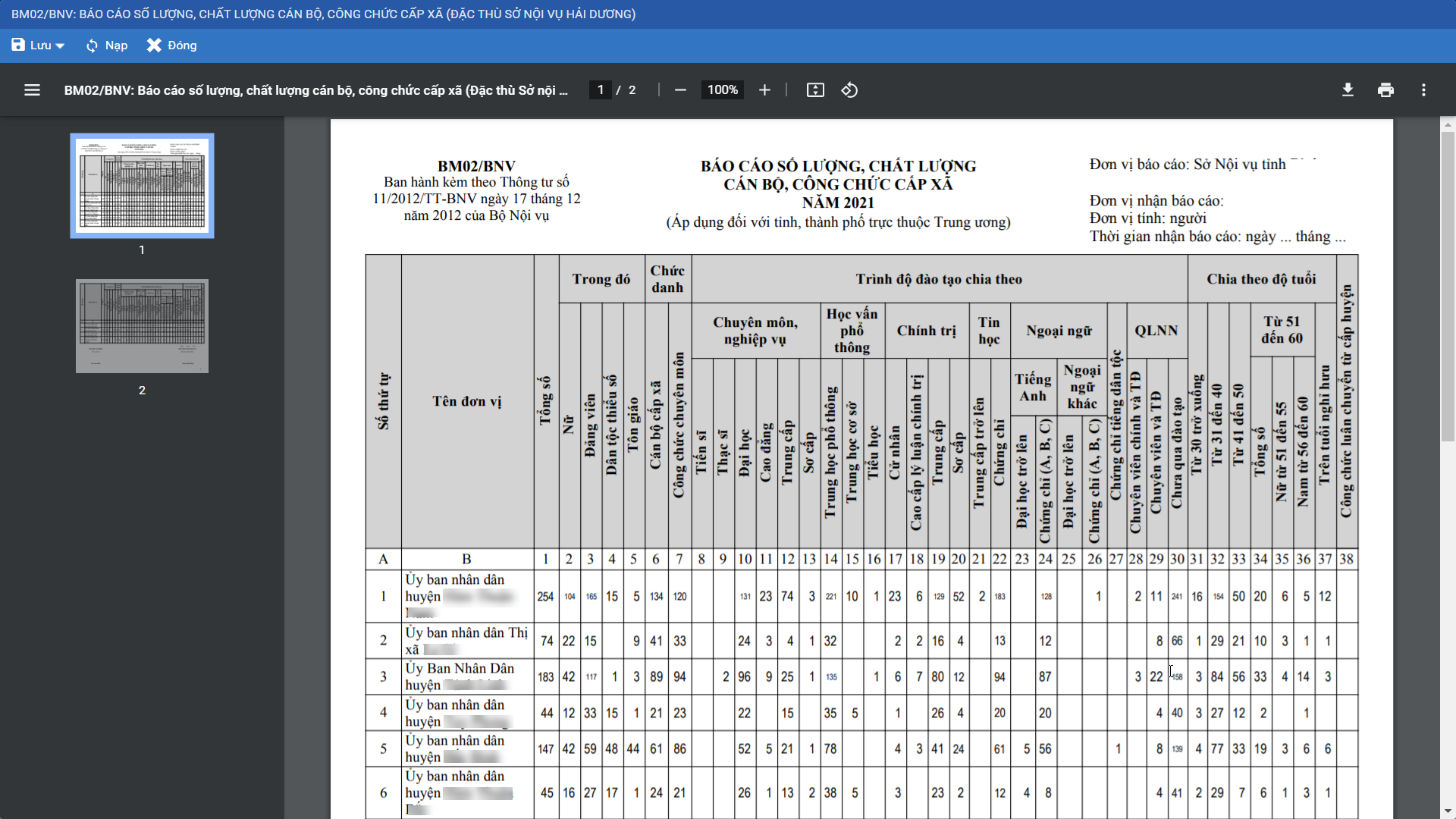 – Trước phiên bản R49, hiện phần mềm đã đáp ứng mẫu báo cáo BM02/BNV tại đơn vị nội vụ, tuy nhiên chưa đáp ứng in mẫu tổng hợp tại SNV Hải Dương.