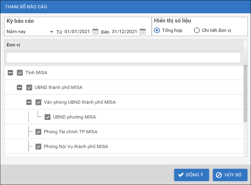 • Tích chọn hiển thị số liệu Tổng hợp hay Chi tiết đơn vị