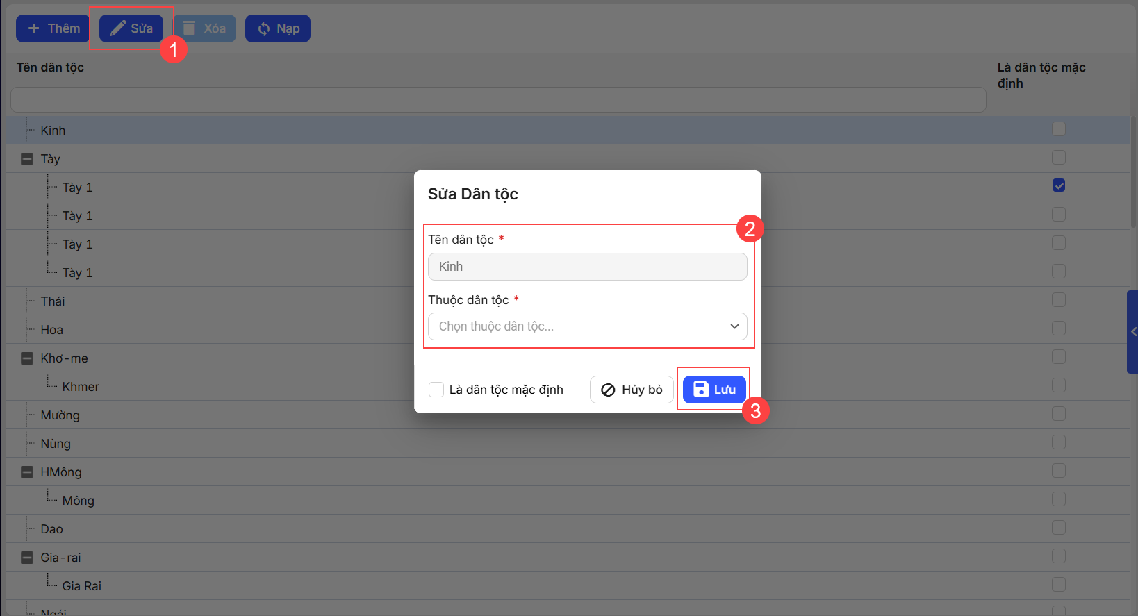 2. Tuy nhiên anh/chị có thể chọn lại danh tộc bằng cách nhấn Sửa, chọn loại dân tộc. Nhấn Cất.